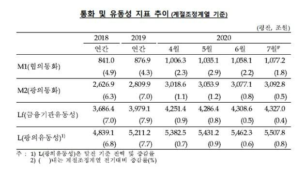코로나19 사태 장기화로 초저금리 기조가 이어지는 가운데 기업과 가계가 대출을 통한 자금 확보에 나서면서 지난 7월에도 시중 통화량이 또 늘었다.