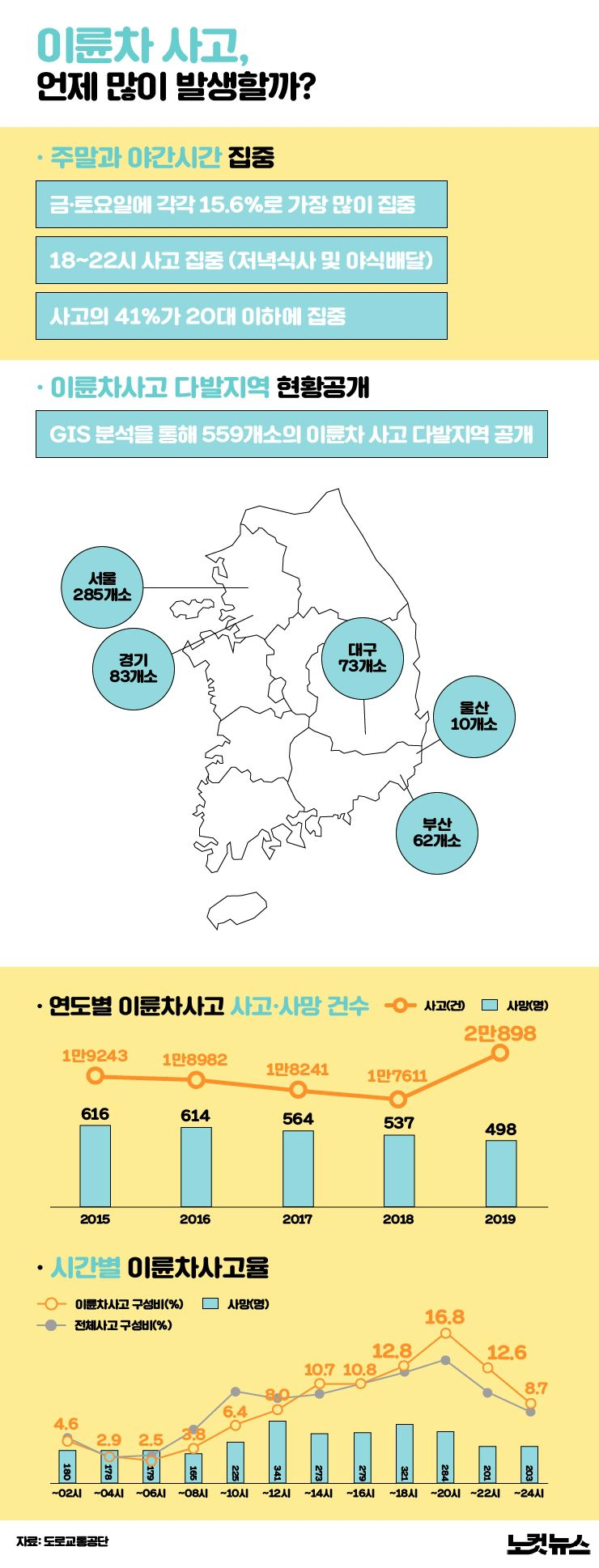 요일별로는 금·토요일에 각각 15.6%로 가장 많이 집중됐고, 전체 교통사고와 대비해서 토, 일요일 비중이 평소보다 높았다. 시간대별로는 18~22시에 사고가 집중되어 저녁식사 및 야식배달이 많은 시간대가 위험한 것으로 조사됐다.