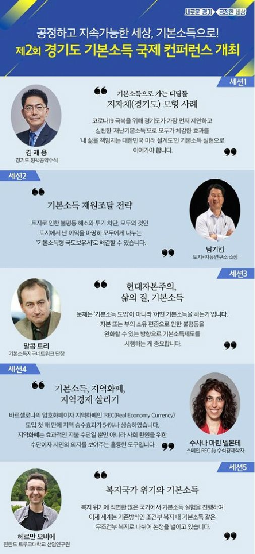 이날 컨퍼런스는 △기본소득으로 가는 디딤돌: 지방정부(경기도) 모형 사례 △기본소득 재원조달 전략 △현대자본주의, 삶의 질, 기본소득 △기본소득, 지역화폐, 지역경제 살리기 △복지국가 위기와 기본소득 등 5개 세션으로 나눠 진행됐다.