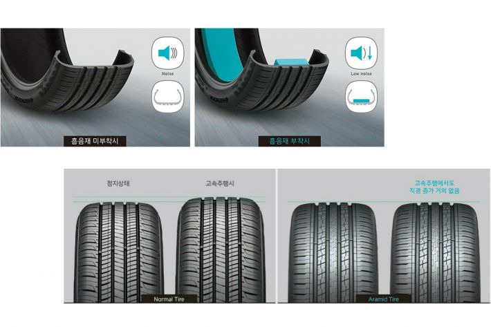 한국타이어의 전기차 전용 타이어 기술. 흡음재 및 고속주행을 위한 아라미드 기술(사진=한국타이어 제공)