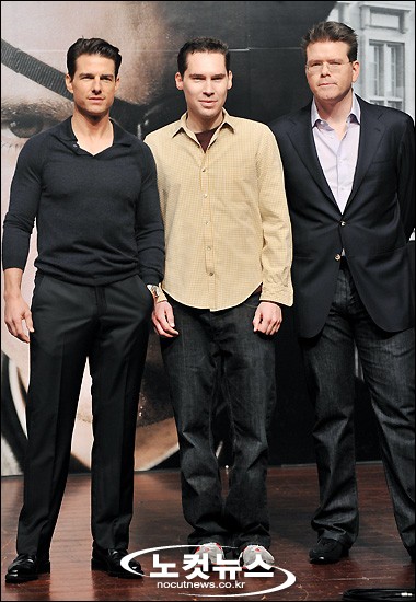 [BestNocut_R]영화 ''작전명 발키리(Valkyrie)'' 홍보차 내한한 할리우드 톱스타 톰 크루즈와 브라이언 싱어 감독, 대본을 쓴 크리스토퍼 맥쿼리 작가(왼쪽부터)가 18일 오후 서울 한남동 그랜드하얏트호텔에서 열린 기자회견에서 포즈를 취하고 있다.