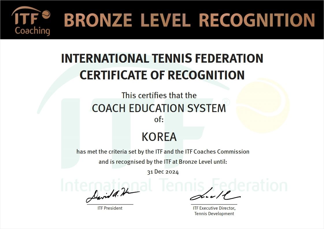 ITF 테니스 개발부 루카 산틸리 전무는 "대한테니스협회가 브론즈 레벨 인증과 관련해 ITF 코치 위원회에서 세운 모든 기준을 만족했다"면서 "한국이 이룬 성과에 대해 축하를 보낸다"고 말했다.