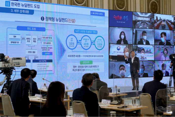 더불어민주당 조정식 의원은 '금융권의 뉴딜 펀드 참여를 정부가 동원한 것이냐'고 물었고, 홍 부총리는 "정부가 강요할 수 없으며 민간 금융회사가 스스로 일부 발표했고 그렇지 않은 곳도 수익성을 보고 많은 참여가 있을 것"이라고 답했다.