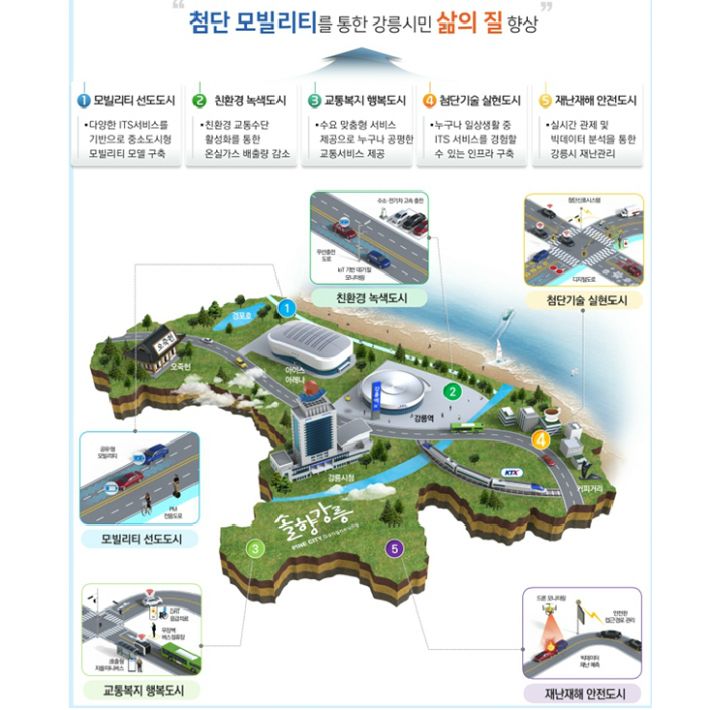 한편 강릉시는 오는 2026년 ITS 세계총회 유치 추진과 함께 올림픽파크 일원의 자율주행차 시범지구 지정, 도심항공교통(UAM) 실증단지 조성, 스마트시티 챌린지 본사업 공모참여 등 정부의 4차산업과 뉴딜사업에 적극 도전해 스마트 도시로의 변모를 기대하고 있다.