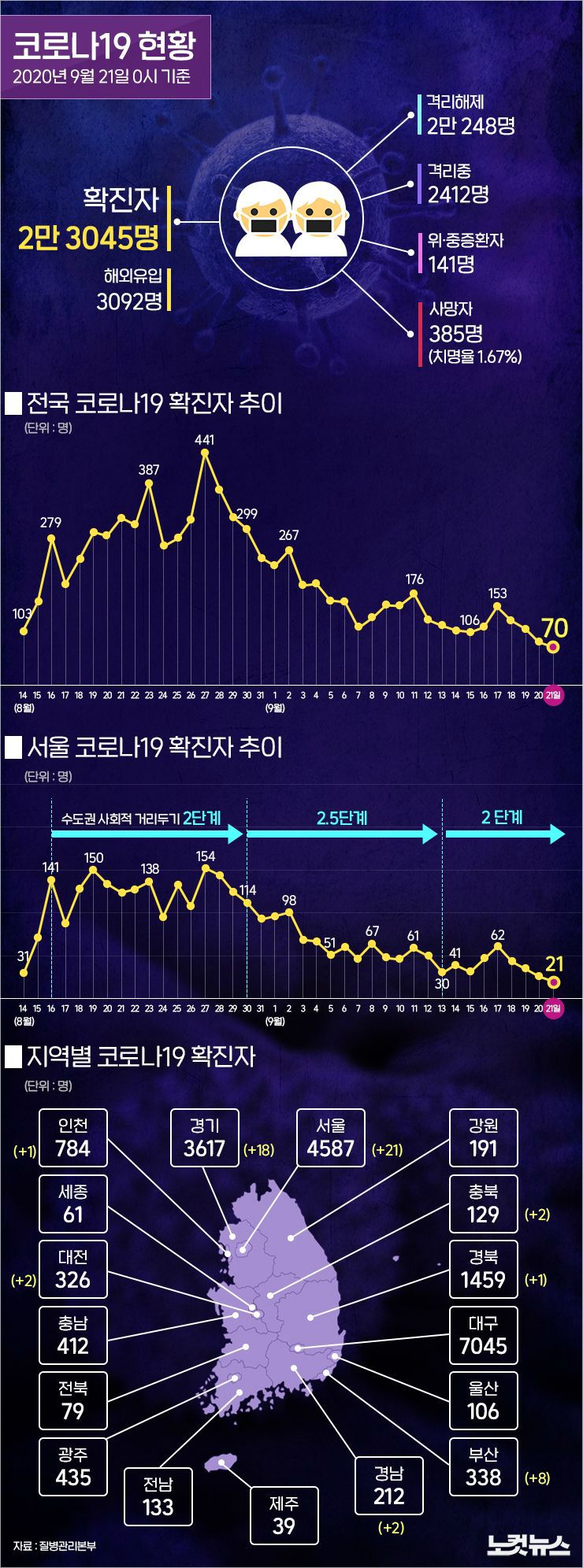 사망자는 전날보다 2명 늘어나 385명이다. 위·중증환자는 5명 감소해 141명으로 나타났다.
