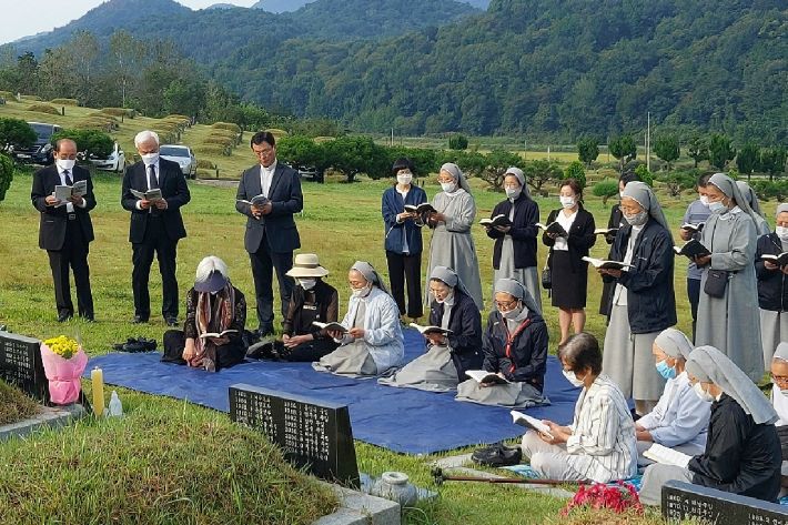 21일 조영대 신부 등이 전남 담양군의 천주교 공원묘원 묘역에서 참배하고 있다.(사진=5·18기념재단 제공)