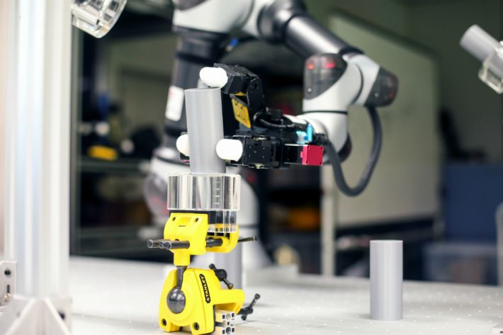 이 로봇은 손가락 2개가 물체를 잡고 나머지 손가락이 물체를 살짝 기울인 상태에서 조립 위치로 끌고 가 흔든다. 이때 부품이 들어갈 구멍 방향으로 합력이 생겨 빨려 들어가는 과학적 원리를 이용한다.