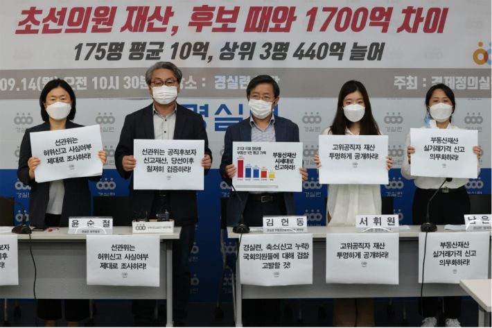 경실련은 "더불어민주당에 관련 국회의원 조사요청 공문을 발송했고 재산변동 폭이 큰 14명의 의원에 대해선 별도의 소명을 요청했다"며 "의혹이 해소되지 않을 경우 다음 주 선관위 조사요청과 형사고발 등 후속 조처를 할 예정"이라고 말했다.