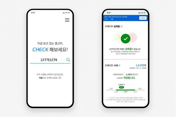 체크는 고객이 입력한 차량 번호를 기반으로 중고차 적정 시세, 실거래 정보, 비슷한 조건의 매물 추천 등 중고차 구입을 앞둔 고객들에게 꼭 필요한 정보를 제공한다.