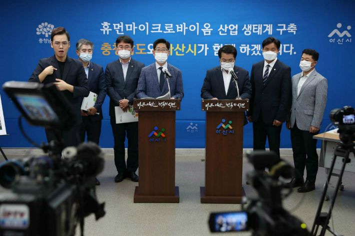 양승조 충남지사와 오세현 아산시장은 29일 아산시청 기자실에서 비대면 온라인 기자회견을 열고 휴먼마이크로바이옴 상용화 제품 기술 개발 사업이 과학기술정보통신부 예비타당성조사(예타) 대상에 최종 선정됐다고 밝혔다.