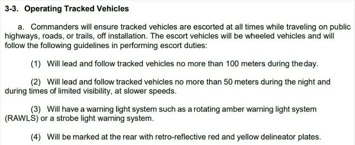 주한 미8군의 한국 내 차량 운용을 규율하는 385-11호 규정도 주한미군은 밤낮에 상관없이 궤도차량이 공공도로를 주행할 경우 눈에 잘 띄는 조명을 부착한 호위차량을 앞뒤로 동행하도록 규정하고 있다.