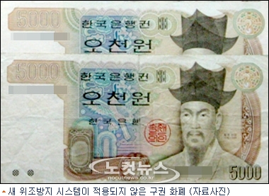 한국은행 관계자는 ''''이번에 발견된 옛 오천원권 위조지폐는 8천장 이상이 두 가지의 동일 지폐 번호로 되어 있다''''고 말했다. 2007년 처음 발견된 번호의 지폐와 2008년 처음 발견된 번호의 지폐가 지난해에 대량 회수되면서 5천원권 위조지폐가 증가했다는 것이다.