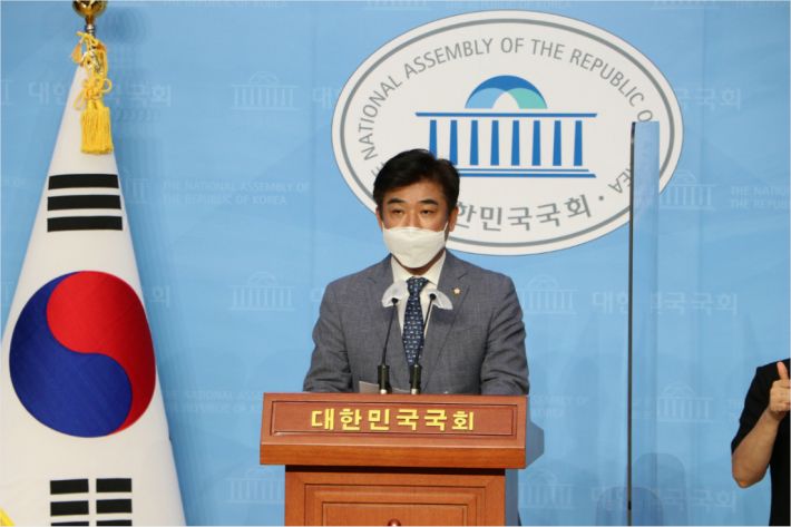 더불어민주당 자본시장활성화특별위원장 겸 정무위원회 간사인 김병욱 의원이 지난달 29일 국회 소통관에서 주식 대주주 범위 확대의 유예를 촉구하는 모습.(사진=연합뉴스)
