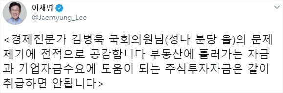 여권 차기 대권주자 가운데 한명인 이재명 경기지사도 지난달 28일 자신의 트위터를 통해 "부동산에 흘러가는 자금과 기업자금수요에 도움이 되는 주식투자자금은 함께 취급하면 안 된다"며 반대 입장을 밝혔다.