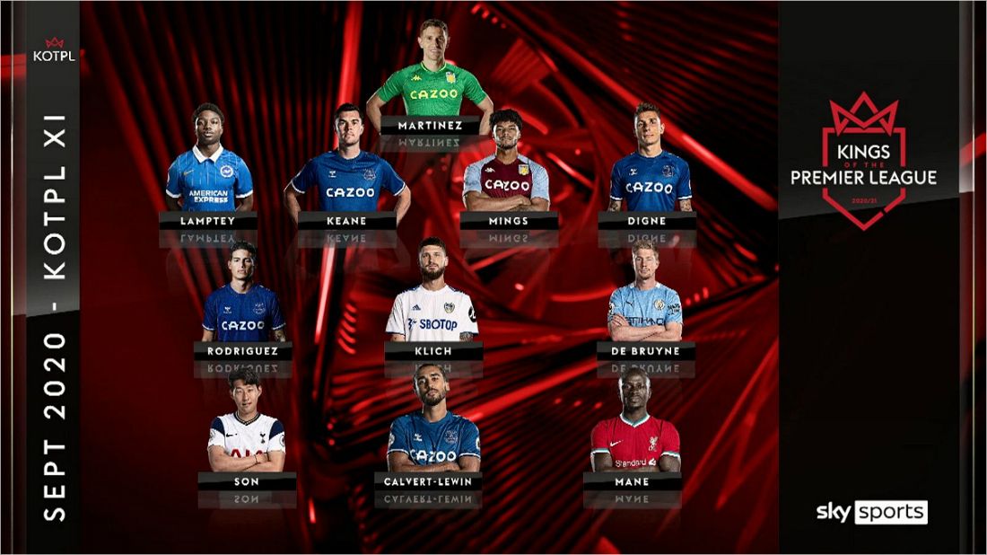 영국 스카이스포츠는 3일(한국시간) 2020-2021시즌 잉글랜드 프리미어리그 9월 활약을 바탕으로 하는 킹스 오브 더 프리미어리그 베스트 11을 선정했다. 스카이스포츠 파워랭킹과 프리미어리그 킹스 오브 더 매치 투표율을 기준으로 해설가 제이미 캐러거, 아스널 TV 진행자 니콜 할러데이가 베스트 11을 뽑았다.