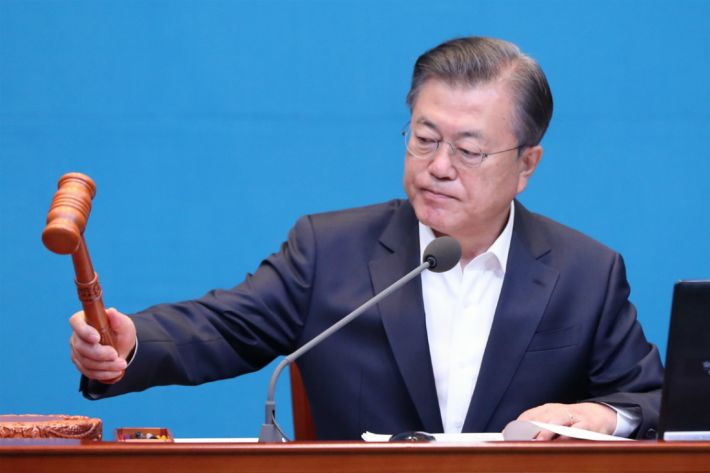 문재인 대통령이 6일 오전 청와대에서 국무회의를 시작하며 의사봉을 두드리고 있다. (사진=연합뉴스)