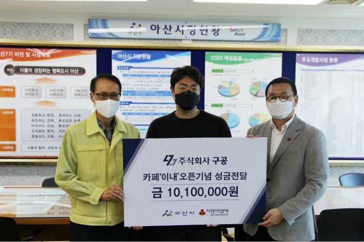 이 날 전달한 성금은 주식회사 구공이 최근 아산 지역에 카페 '이내'를 오픈하면서 이를 기념해 기탁했으며 앞으로 아산시청 사회복지과와 협의를 통해 저소득 계층을 위한 사업에 사용될 예정이다.