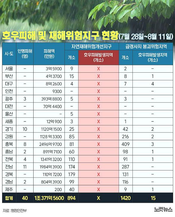 이처럼 호우피해가 재해위험지구를 절묘하게 피해 가는 동안 전국 각지에선 40명의 인명피해와 1조 371억원 수준의 재산 피해가 발생했다. 특별재난지역도 74곳이 선포됐다.