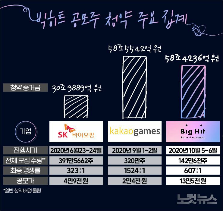 그룹 방탄소년단(BTS)의 소속사 빅히트엔터테인먼트는 청약도 빅히트를 쳤다. 그러나 역대 청약 증거금 1위를 기록한 카카오게임즈에는 간발의 차로 뒤져 역대 청약 증거금 2위를 기록했다.