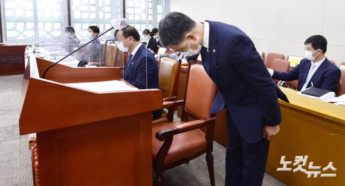 박능후 보건복지부 장관이 7일 국회에서 열린 보건복지위원회의 보건복지부-질병관리청 등에 대한 국정감사 업무보고에 앞서 인사를 하고 있다.