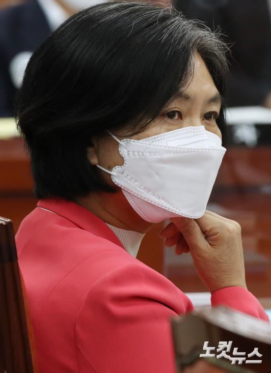 열린민주당 강민정 의원이 7일 국회에서 열린 교육위원회 국정감사에 참석하고 있다.