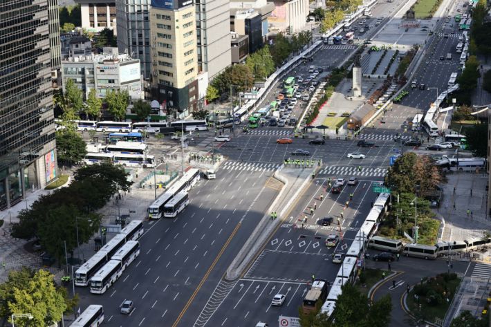 9일 경찰에 따르면 경찰은 이날 오전 7시쯤 서울 광화문 일대 등에 차벽 설치를 완료했다. 다만 지난 3일 개천절 당시 차벽이 광화문 광장을 빙 둘러싸던 것과 달리 이번에는 일부 도로변에만 만들어진 상태다.