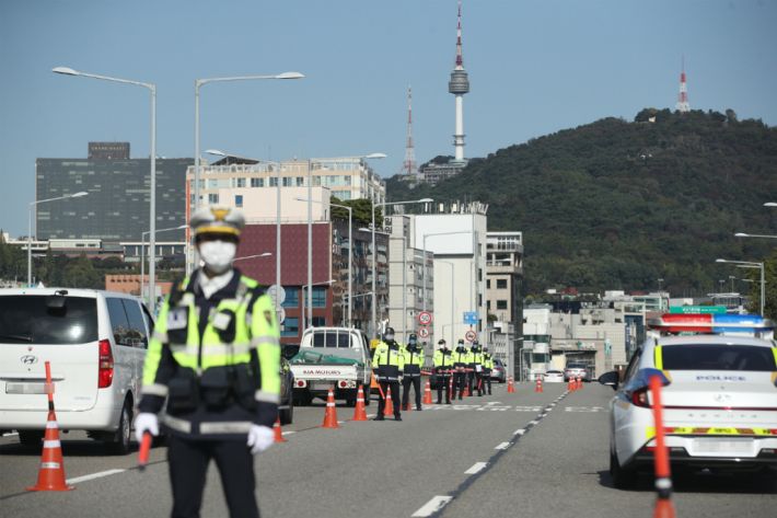 9일 오전 서울 한남대교 북단에서 경찰이 차량을 검문하고 있다. 한글날이자 연휴의 시작인 이날 서울 도심에서 일부 단체가 예고한 대규모 집회는 금지됐지만 기자회견이나 차량시위 등은 진행될 것으로 보여 방역당국과 경찰이 긴장하고 있다. (사진=연합뉴스)