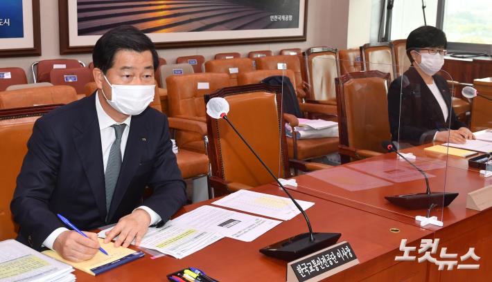 권병윤 한국교통안전공단 이사장과 김진숙 한국도로공사 사장이 12일 국회에서 열린 국토교통위원회의 한국도로공사·한국교통안전공단에 대한 국정감사에서 의원들의 발언을 듣고 있다.