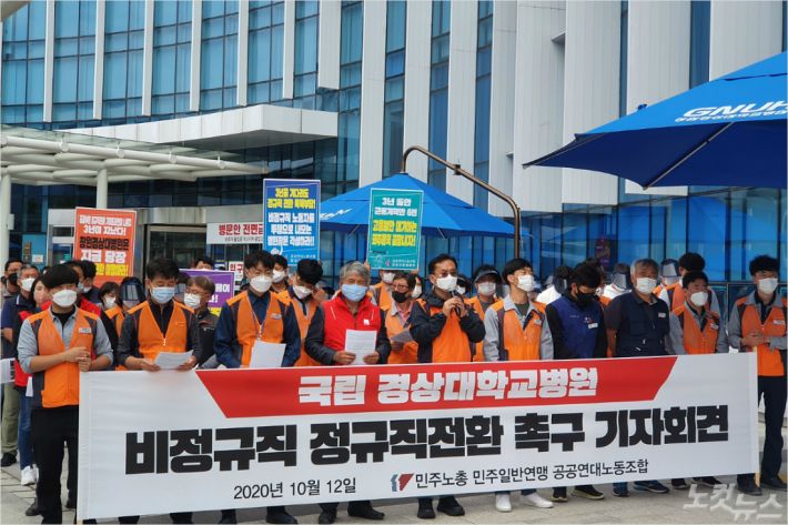 경상대병원(창원·진주)에는 청소·시설·보안·통신·콜센터 등의 업무를 하는 450여 명의 비정규직이 있다. 이들은 원래 2017년 정부가 발표한 공공부문 비정규직 정규직 전환 지침에 따라 정규직 전환 대상이다.