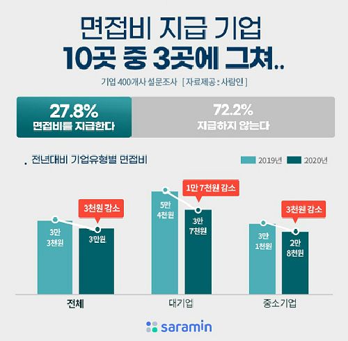 면접비는 평균 3만원으로 집계돼, 지난해 3만3000원 보다도 3000원 적었다. 기업별로는 대기업이 3만7000원, 중소기업이 2만8000원으로, 지난해와 설문조사와 비교하면 중소기업은 3000원, 대기업은 무려 1만 7000원이 감소했다.