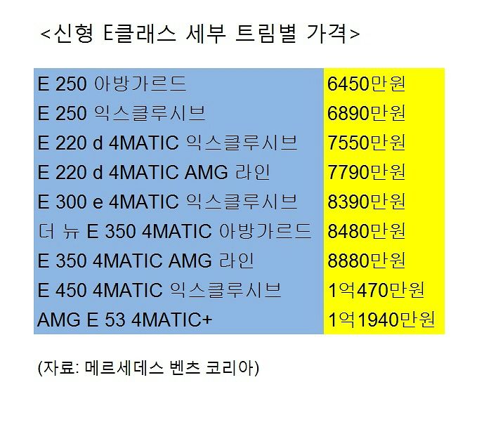 '더 뉴 E350 4MATIC 아방가르드', '더 뉴 E350 4MATIC AMG 라인', '더 뉴 E450 4MATIC 익스클루시브', '더 뉴 메르세데스-AMG E 53 4MATIC+' 등이 있다.