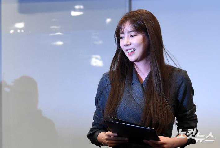 조폐공사 명예홍보대사인 배우 손담비가 14일 오전 서울 중구 대한상공회의소에서 열린 한국조폐공사 '2020 보안기술 설명회'에 참석해 인사말 후 자리로 돌아가고 있다.