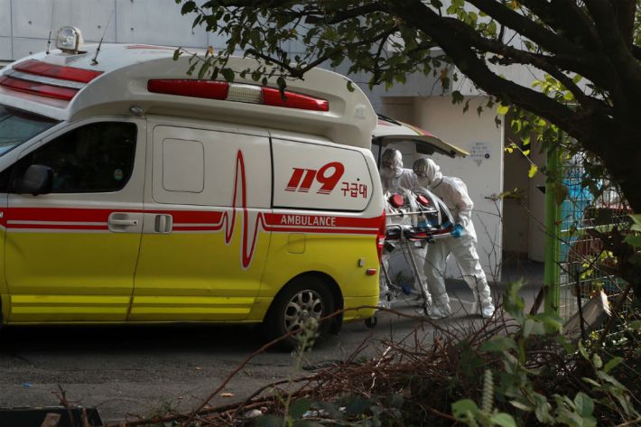 14일 오후 부산 북구 만덕동 해뜨락 요양병원에서 확진자가 이송되고 있다.(사진=연합뉴스)