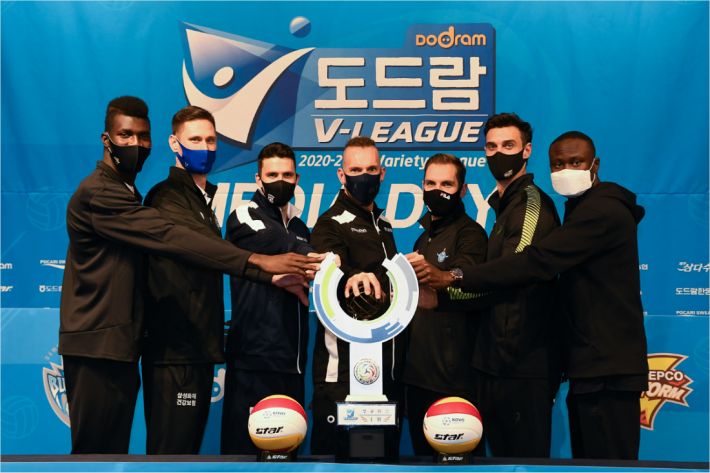 한국배구연맹은 14일 오후 서울 리베라호텔에서 7개 구단 감독과 대표 선수가 참여한 가운데 '도드람 2020-2021 V-리그' 남자부 미디어데이를 개최했다. 행사에는 각 팀의 외국인 선수 7명도 함께했다.