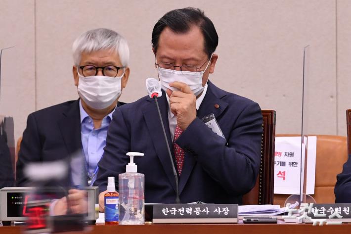 김종갑 한국전력공사 사장이 15일 오전 서울 여의도 국회에서 열린 산업통상자원중소벤처기업위원회의 한국전력공사, 한국수력원자력, 한국남동발전 등에 대한 국정감사에 출석해 의원 질의를 들으며 생각에 잠겨있다.