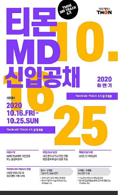 국내 최초 타임커머스 티몬이 두 자릿수 규모의 신입 MD 공개 채용을 시작한다고 16일 밝혔다. 서류접수 후 빠르면 1주일만에 입사가 가능한 '수시형 공채' 제도로 진행해 지원자 만족도를 높이고 감염위험을 최소화한다는 계획이다.