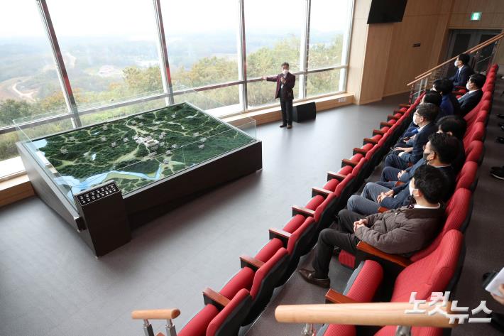 송영길 위원장 등 국회 외교통일위원회 소속 의원들이 16일 현장 국정감사 차 경기 파주시 도라산전망대를 방문하고 있다. 이날 현장 방문에는 국민의힘 위원들은 불참했다.