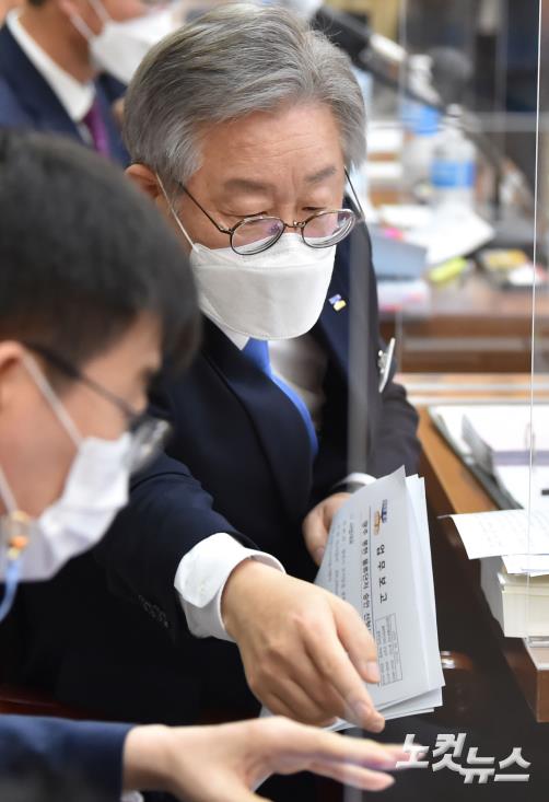 이재명 경기도지사가 19일 경기도 수원시 팔달구 경기도청에서 열린 국회 행정안전위원회의 경기도에 대한 국정감사에서 자료를 살펴보고 있다. (사진공동취재단)