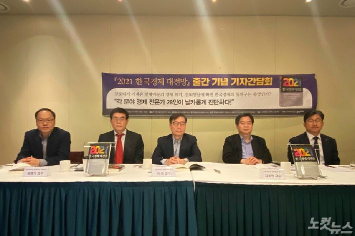 대표 저자인 서울대 경제학부 이근 교수는 21일 서울 중구의 한 식당에서 열린 기자간담회에서 "코로나19가 종식된다 해도 전 세계적으로 내년 경제 상황은 녹록치 않을 것"이라며 "우리 경제는 내수와 수출, 재정지출과 국가채무, 미국과 중국 사이에서의 선택 등 3가지 진퇴양난의 기로에 놓여있다"며 이렇게 말했다.