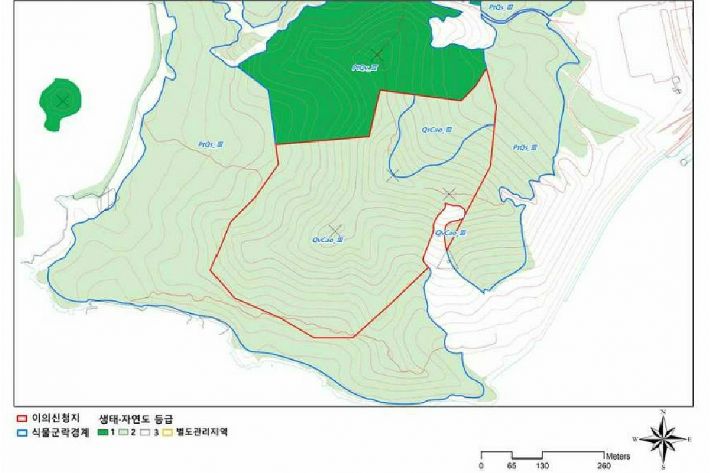 1등급지에서 제척된 곳은 '굴참나무-소나무 군락'과 '졸참나무-소나무 군락' 분포지로 기존 1등 급지의 2/3 정도에 이르는 면적이다.