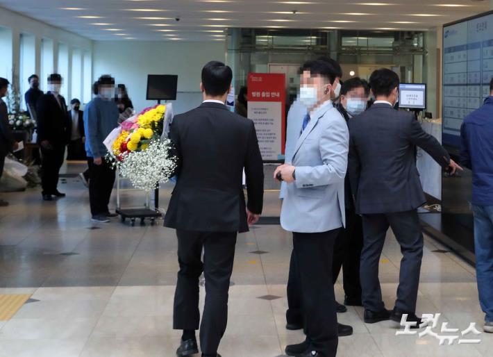 25일 이건희 삼성 그룹 회장의 빈소가 마련된 서울 삼성병원 장례식장 로비에서 보안요원들이 주문객들을 살피고 있다.