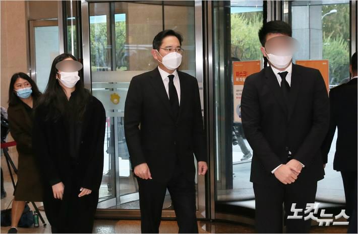이재용 삼성전자 부회장과 딸 이원주, 아들 이지호가 25일 오후 4시 54분께 서울 강남구 삼성서울병원 장례식장에 마련된 故 이건희 삼성그룹 회장의 빈소로 이동하고 있다.