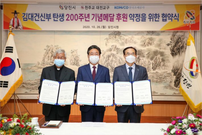 당진시와 천주교 대전교구, 한국조폐공사는 26일 당진시청에서 김대건신부 탄생 200주년 기념메달 제작과 관련 후원 약정 협약을 체결했다.