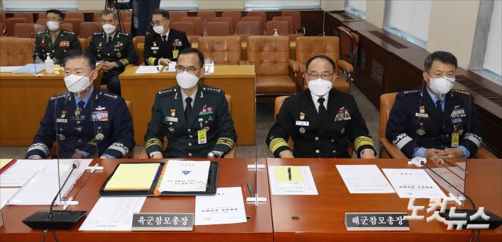 원인철 합동참보본부 의장, 남영신 육군참모총장, 부석종 해군참모총장, 이성용 공군참모총장이 26일 오전 서울 여의도 국회에서 열린 국회 국방위원회 종합국정감사에 출석해 국감 시작을 기다리고 있다.