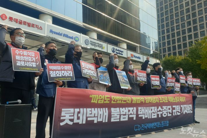 26일 전국택배연대노동조합(택배노조)은 서울 중구 롯데글로벌로지스 본사 앞에서 기자회견을 열고 "택배접수중단 조치는 택배노동자에겐 직장폐쇄와 다름없는 악질적인 횡포"라면서 "아무런 쟁의행위 절차도 밟고 있지 않은 상황에서 벌어진 명백한 불법행위이며 부당한 노동행위"라고 주장했다.