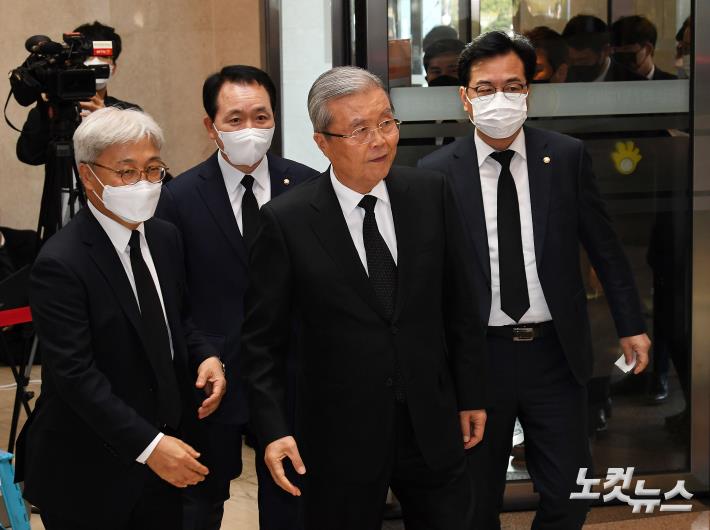 김종인 국민의힘 비대위원장(왼쪽 세번째)이 26일 오후 고 이건희 삼성그룹 회장 빈소가 마련된 서울 강남구 삼성서울병원 장례식장에 들어서고 있다.