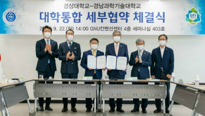 지난 달 22일, 경상대학교 권순기 총장과 경남과학기술대학교 김남경 총장은 대학통합 세부협약서와 부속합의서를 체결했다. (사진=경상대학교 제공)