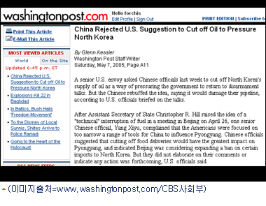 미국이 북한에 대한 석유 공급을 중단해달라고 중국측에 요청했으나 거절당한 것으로 드러났다.