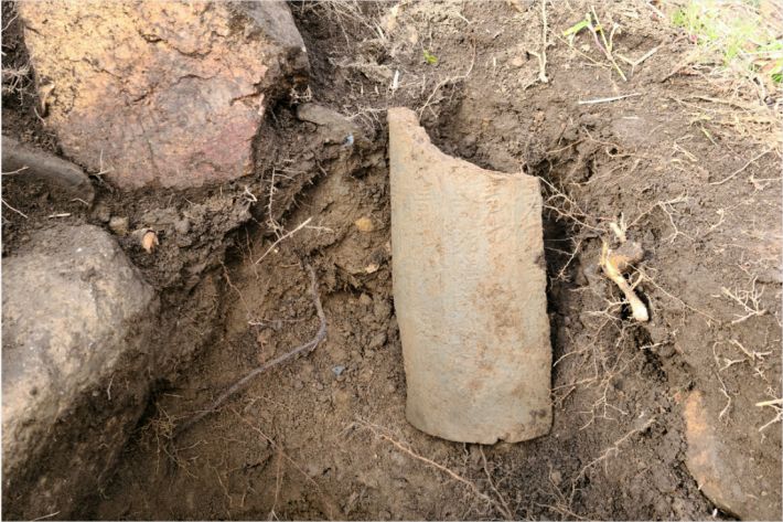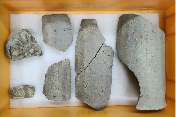 동쪽 축대 앞에서 출토한 명문기와. (사진=경주시 제공)