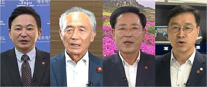 원희룡 제주도지사와 정현찬 대통령직속 농어업·농어촌특별위원장, 좌남수 제주도의회 의장, 국회 농해수위 소속 위성곤 국회의원(왼쪽부터) 등이 각각 대회사, 환영사, 축사 등 영상 메시지를 통해 6차산업의 지속적 성장을 기원했다. (사진=박람회 조직위원회 제공)